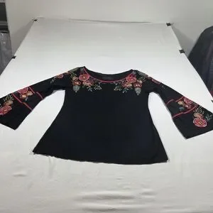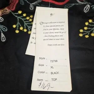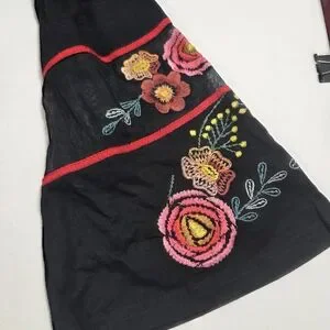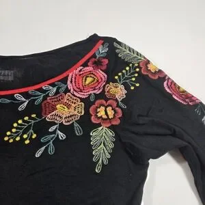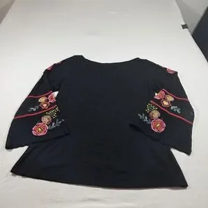 This elegant black blouse is adorned with vibrant floral embroidery, perfect for adding a touch of sophistication to any outfit.
