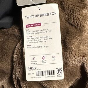 Sleek black bikini top with twist design. Low coverage neckline. Adjustable straps for perfect fit.