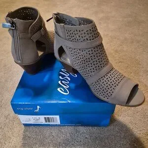 New, never worn, Easy Street Carrigan cutout open toe bootie in gray in original packaging. Size 7.5 medium. Back heel zipper and 2-inch heel.