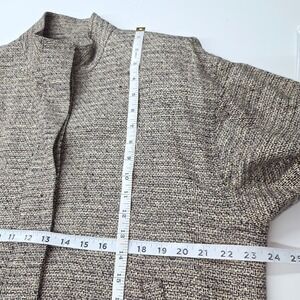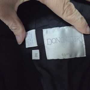 Doncaster silk tweed bomber jacket in size medium. This stylish jacket features a unique tweed-like texture woven from 100% silk, a flattering stand collar, and a classic bomber silhouette with elasticized cuffs and hem. The front closure is accented with a single dark button. Shoulder pads add dimension and one pocket is still sewn shut.