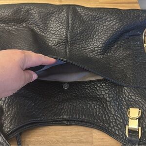 Chic black tote with elegant texture. Gold hardware adds a touch of luxury. Perfect for versatile styling. Genuine leather. No damage. Clean new condition. Missing the tag and the tag that hangs on the purse. Inside has the style name and details. Genuine leather! Amazing quality. Large bag and great for daily use. Comes from a pet free smoke free home! The interior is a gray suede polyester. Zipper details on the sides. So cool and unique! Material outside is genuine leather. Make me your offer