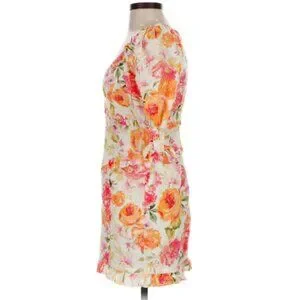 Super cute linen-blend dress with beautiful floral print. Puff sleeves, v-neck, and tie sleeves. Zip closure on back. In perfect condition.
