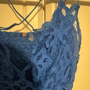 Elegant blue lace dress with a flowing skirt and intricate detailing. Needs to be ironed/steamed. Size medium.