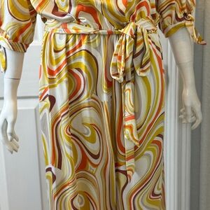 CHELSEA TAYLOR stylish multicolor swirl jumpsuit. Perfect for any occasion, this jumpsuit features a vibrant design with shades of orange, yellow, and cream. The comfortable fit and eye-catching pattern make it a must-have addition to your collection jumpsuit in good condition.