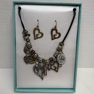 This beautiful necklace and earring set has a love dangle charm love theme. Multiple hearts, crosses, keys, and many more charms dangling between multicolor metal beads. All this hanging on a black leather double cord with dangle heart coordinating earrings. Brand new on original box but box cover is missing. Comes from a smoke free home. Retail cost $26.
