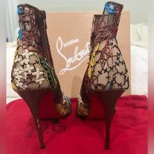 Authentic Christian Louboutin Miss Tennis 100 booties featuring the brand’s iconic embroidered mesh with multicolor floral and butterfly detailing. A rare, statement style with a sleek pointed toe and signature red sole.
