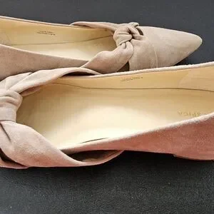 Experience elegance with Via Spiga's tan flats, featuring a sophisticated decorative knot detail. These shoes combine comfort and style, making them perfect for dressy casual occasions. The flat leather sole and pointed toe design ensure a chic and versatile look.