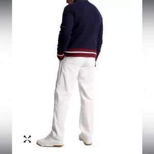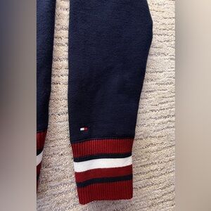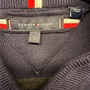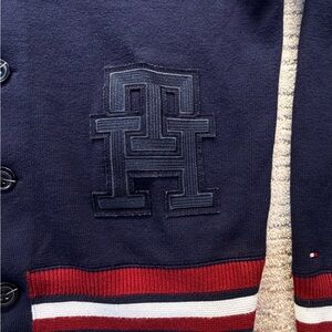 Great like new condition Tommy Hilfiger Men's Monogram Logo Appliqué Knit Varsity Bomber in a navy blue color. Size Large