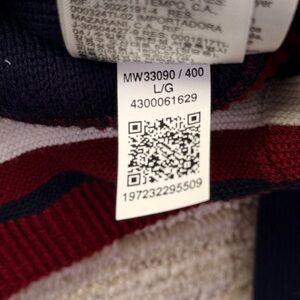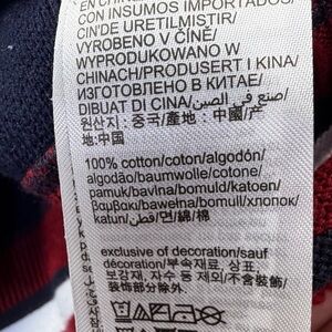 Logo patch appliqué at front left waist; embroidered flag logo at lower left sleeves, ribbed-knit contrast-striped cuffs and hem