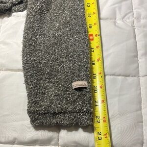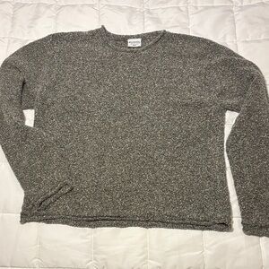 Stay warm and stylish with this classic gray sweater. Material is rolled at neck, sleeve openings and bottom. Dark Heather gray with flecks of cream.
