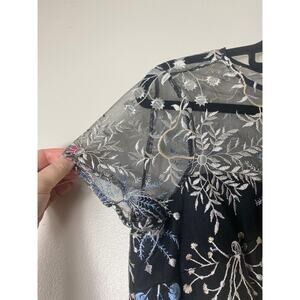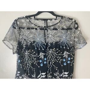ADRIANNA PAPELL DRESS 10 ILLUSION NECK EMBROIDERED BLUE FLORAL SHEER MESH SHORT SLEEVE COCKTAIL MINI SUBTLE ASYMMETRIC HIGH LOW HEM FIT & FLARE EDGY