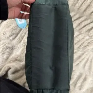Authentic Prada Milano tote bag in deep green nylon with silver-tone hardware. This classic, lightweight bag features double shoulder straps, a spacious zippered interior with Prada logo lining, and the iconic Prada metal triangle logo on the exterior.