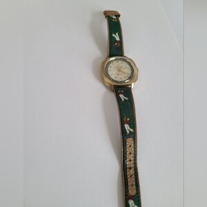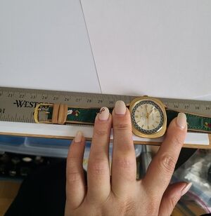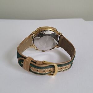 Vintage Men's Wittnauer Longines Luxury Geneve Automatic Time and Date Gold Square Bezel Watch with Green Brown Genuine Leather Strap with Golf Motif