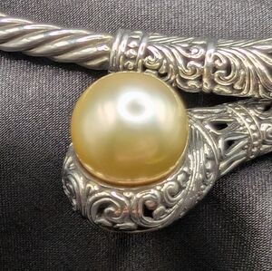 Simply stunning! This piece is solid, handmade 925 sterling silver adorned with two 10mm genuine South Sea Pearls. The pearls are AAA-A grade. Perfectly matched and extremely rare! You can see in the photos that the pearls have a perfect mirror luster. Balinese craftsmanship is second to none when it comes to the details in their silversmithing. It's an expandable choker style that accommodates up to a 19 inch neck.