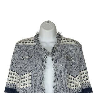 Chicos Blue White Textured Knit Fringe Boho Cottagecore Cardigan Small