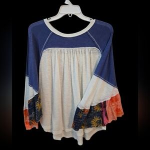 The We The Free Patchwork Bell Butterfly Sleeve Blouse in blue, size medium, features a colorblock pattern and a round neckline with a pullover closure. This boho hippie fairy style top is perfect for travel and casual occasions, made from a blend of polyester, linen, and cotton for easy care and a relaxed fit. The 3/4 bell sleeves and lightweight, breathable design make it ideal for wearing during the summer, fall, and spring seasons. Made in Vietnam, this blouse is a basic yet stylish addition to any woman's wardrobe.