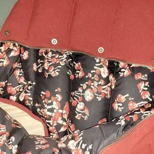 Stylish Patagonia vest with a hood. Red body with gray shoulders. Floral patterned lining. Perfect for layering.