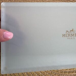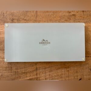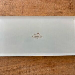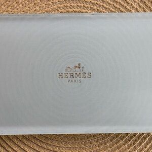 Sophisticated Hermès tray in frosted very pale green glass. Features elegant silver detailing that says “HERMES Paris” with logo. Ideal for luxury decor. Perfect for your perfume, cosmetics, or toiletries. Excellent condition. The tray measures 9-3/4” x 4-3/4”