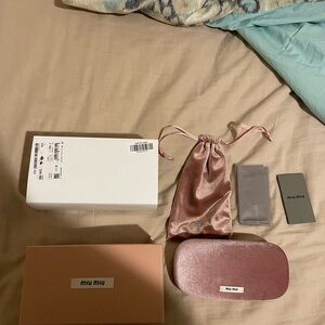 Brand New Miu Miu sunglasses (purchased from FarFetch - tag is still attached) will come packaged in the plastic they came in, as well as their box, hard sunglasses case, soft sunglasses case (pouch) and cleaning cloth. On site for $367 currently.