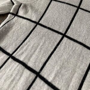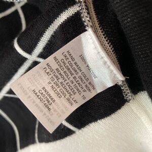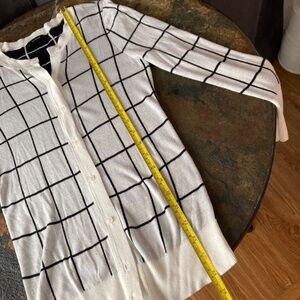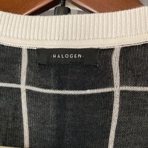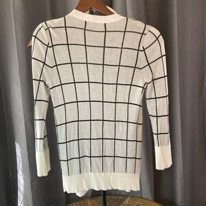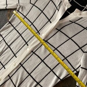 A Halogen from Nordstrom classic window pane cardigan sweater. Ivory with black window pane striping. Lightweight with 3/4 sleeves. Button down style cardigan can be worn buttoned or open and layered. Pre-loved with some signs of wear. Slight pilling on material. Please note all pics for condition and approximate measurements. Classy little cardigan. Size tag is missing but measurements are consistent with an XS.