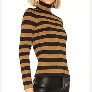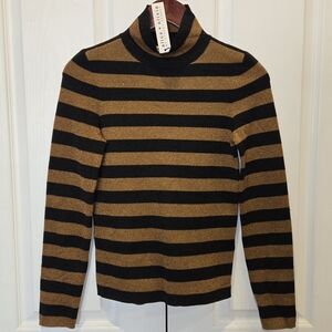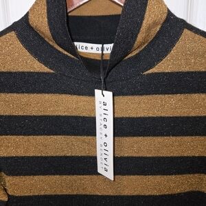 New with tags Alice + Olivia turtleneck sweater featuring a striking gold and black metallic knit for a bold, elevated look. Designed with a classic turtleneck neckline and a sleek, flattering silhouette, this sweater adds instant glam to any outfit.