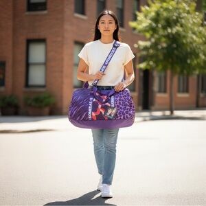 Brand New With Tags official Someday by Justin Bieber duffel bag in a bold purple mixed-print design. Features zebra stripes, leopard print, and heart graphics with branded “Someday” carry straps. A rare and eye-catching piece perfect for travel, overnight stays, gym use, or collectors of Justin Bieber merchandise.