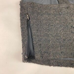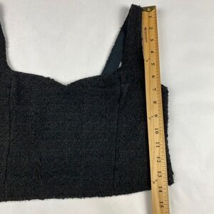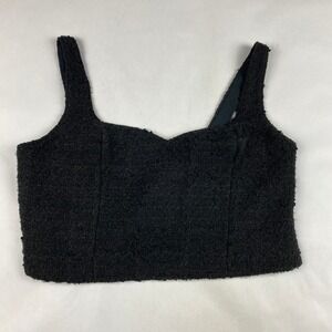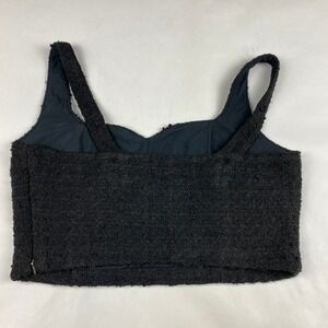 Black tank features cropped fit with sweetheart neckline, adjustable button straps, hidden side zip. Textured tweed fabric.
