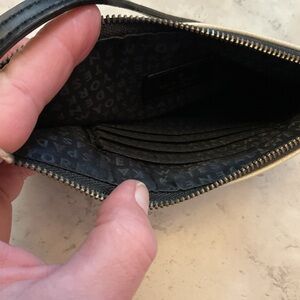 Kate Spade New York black and white stripes, Dawn Sailing Stripe, Saffiano leather trim, clutch or wristlet, multiple compartments with card slots and a zip closure. Ideal for adding sophistication to any look.