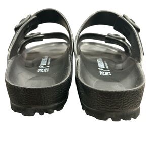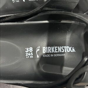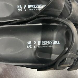 Birkenstock Arizona double strap sandals in classic black leather with iconic adjustable buckles. These are authentic Birkenstock Germany sandals in size 38 EU (fits US women's 7-7.5). Features the signature contoured cork footbed for all-day comfort and support.