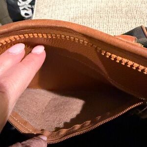 The original exterior zipper pull was missing. It has been professionally replaced with a coordinating pull, and a matching decorative pull has been added to the interior zipper for a cohesive look. Zippers function smoothly.