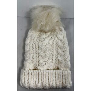 Time and Tru Cable Knit Beanie Winter Hat Faux Fur Pom Cream One Size New