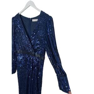 Elegant and glamorous full-length gown by Mac Duggal featuring allover shimmering sequins in deep navy blue. The design includes a flattering surplice V-neckline, long sheer sleeves with fabric-covered button cuffs, and a figure-enhancing waistband.