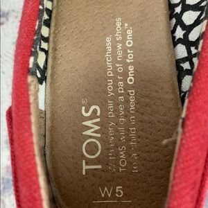 Good Condition Toms Red Canvas Peep Toes Wedges. Glue shows a little but sandals and everything is still in tack (see two last picture). Heels measures 3’ and 1/2’ front