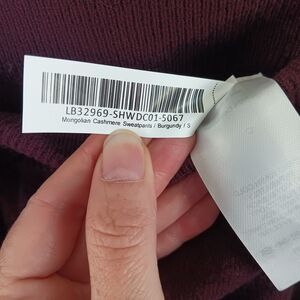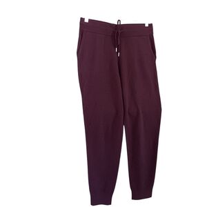 Quince Mongolian Cashmere Joggers featuring a drawstring tie waist, pockets, cuffed ankles, burgundy maroon color, high rise, and casual athleisure yet chic sweatpants look. Size small (15" waist, 27" inseam). Perfect for any occasion or just lounging.