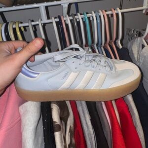 Stylish Adidas Samba sneakers in white with silver details. Features a gum sole for a classic look.