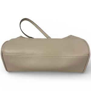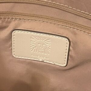 Beautiful Anne Klein embossed satchel in a soft cream/ivory tone with silver-tone hardware and chain-detail straps. Top-zip closure, exterior slip pocket, and logo-lined interior with zipper pocket. Chic and classy — perfect for everyday wear or work.
