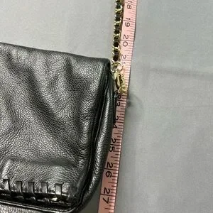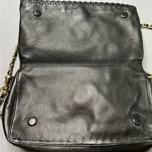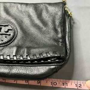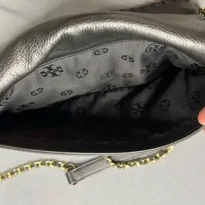 Chic black leather crossbody bag by Tory Burch. Features a stylish chain strap. Perfect for versatile wear.
