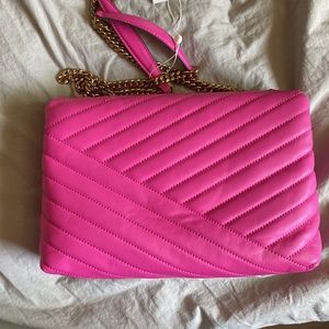 Vibrant pink quilted design. Gold chain strap. Iconic Tory Burch logo.