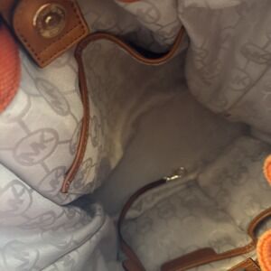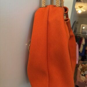 Michael Kors orange canvas bucket bag with rope handles and gold-tone MK logo charm. This vibrant, casual bag is perfect for summer, beach outings, or adding a pop of color to your everyday look. The sturdy rope handles provide a comfortable carry, and the spacious interior allows you to carry your essentials. Excellent pre-owned condition with minimal signs of wear.