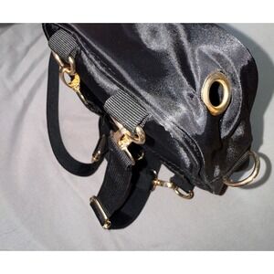 Featuring a sleek black exterior and gold hardware accents, this small bag is perfect for carrying essentials on-the-go.
