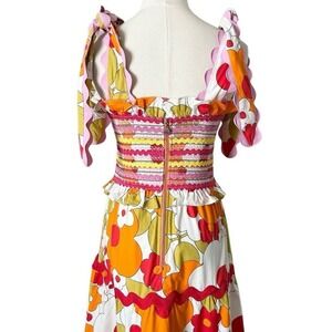 Celia B midi dress showcasing a vibrant floral print with a playful shirred bodice. This dress features a square neckline, short puff sleeves with scalloped trim, and tie shoulder details for a customizable fit. The smocked bodice is adorned with colorful horizontal stripes and delicate ruffles, leading to a flowing A-line skirt with tiered sections and ruffled hems. A back zipper closure ensures a secure fit. Perfect for a summer garden party, a vacation getaway, or a chic daytime event.
