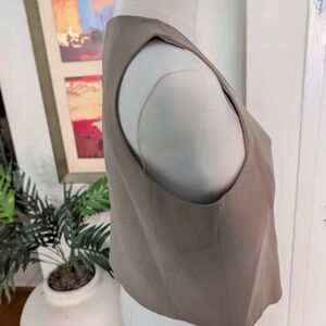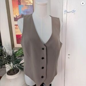 Stylish Aritzia vest. olive color with buttons. Perfect for layering. As versatile as the actor This is a classic button-up vest with princess seams for shaping. It’s expertly tailored with Mirror Crepe™ — essential crepe fabric with a soft drape and silky satin back. It’s sourced from an innovative Japanese mill and made with wood-based fibres from responsibly managed forests with a focus on protecting ecosystems.