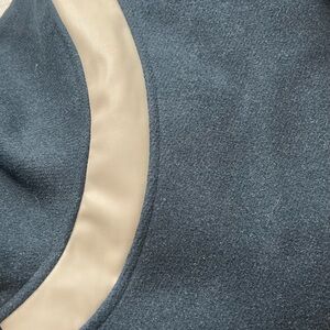 Stylish navy bomber jacket with white accents. Features a classic collar and button closure. Perfect for layering.