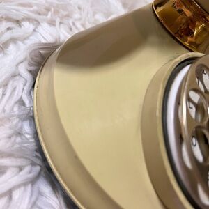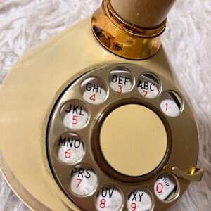 The Candlestick Rotary Telephone 1973 Western Electric Vintage Decor No Cord. A vintage candlestick telephone from 1973. A pale yellow tan color. Gold/brass detailing. Dial can be moved with no problem. There is no cord so I am not sure if it works. Has been used a cool vintage decor piece. Good vintage condition with some signs of wear. Does have some light scratches/ marks in a couple areas. The mouthpiece is off centered and bottom is faded. Bottom labels have faded off and has some melted orange marks. And again no cord. See last pics for examples.