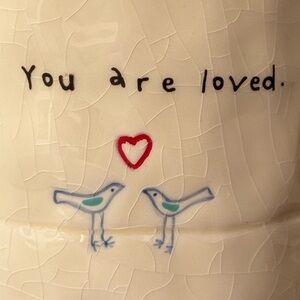 Delightful cream-colored mug by Natural Life. Features a red heart and blue birds motif with the saying “you are loved.” It is “crazed” as you can see in the photos, but that just adds charm and a heartfelt meaning. Ideal for warm beverages. Holds 8 oz.