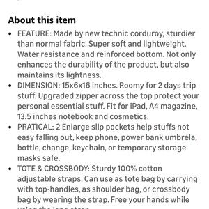 Stylish and versatile beige corduroy tote bag. Perfect for everyday use with a spacious interior and durable design. Sturdy 100% Cotton adjustable straps.
