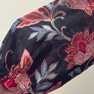 Color: very dark navy blue, almost black. Pink and red flowers with blue petals.