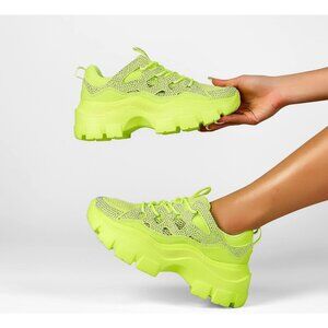 Women Neon Yellow Rhinestone Platform Fuchsia Hologram Casual Lace-Up Sneakers
