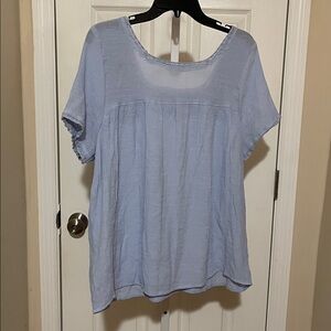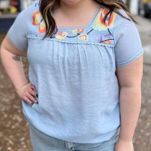 New without tag, in excellent condition, Perch by Blu Pepper Women's Blouse Top Size 2XL, Blue Color, Short Sleeve, Front and sleeves decorated with lace and floral embroidery, Made in China of 63% Rayon 37% Polyester, Hand wash cold Measurements: pit to pit laying flat is 25" bottom laying flat is 29.5" sleeve length is 8" overall top length is 26"
