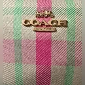 This Mini Coach Jamie in the pink plaid print is crafted in a jacquard and smooth leather. The interior is lined in a light brown fabric and features a snap pocket and 2 cc slots. The exterior features a slip pocket on the backside and the Coach horse and carriage pinmount logo on the front.